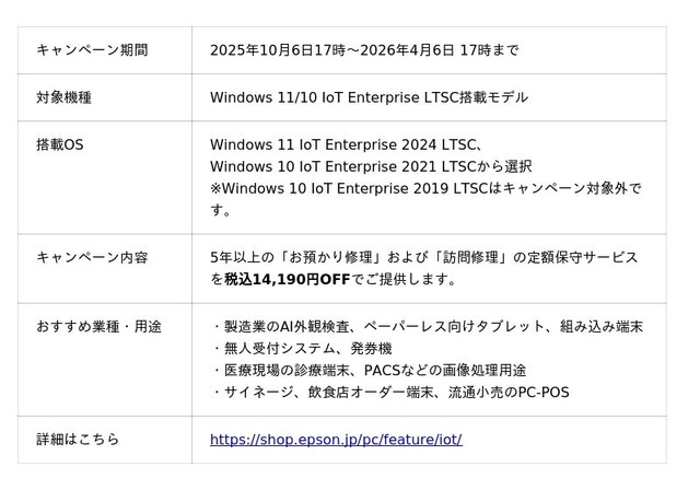 Windows 11/10 IoT Enterprise LTSC 搭載PCの導入をご検討中の法人様向けに、エプソンでは「長期保証がお得なキャンペーン」を実施します。