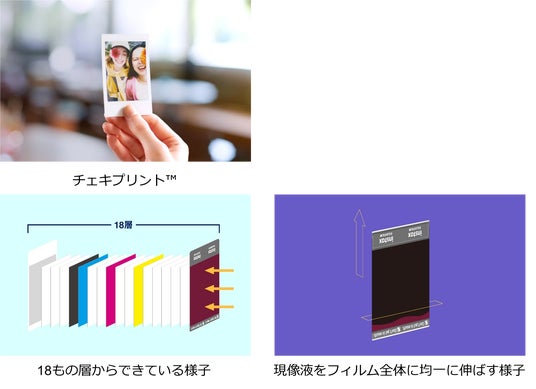 instax(TM)フィルム(以下、フィルム)には銀塩写真としてプリントができあがるまでの仕組みが詰め込まれています。instax(TM)“チェキ”のカメラで撮影すると、カメラのレンズを通った光がフィルムの裏から当たり、露光が始まります。厚さわずか数十マイクロメートルのフィルムには、さまざまな役割を持った18もの層がまざることなく薄く塗布されています。カメラからフィルムが出てくるときにフィルム内に封入された現像液の袋が破れ、緻密に設計されたカメラのローラーが、現像液をフィルム全体に均一に伸ばし、化学反応によって現像が進みます。現像が始まってから画像が浮かび上がるまでの約90秒の間に、露光した光の色によってフィルム内の異なる色の層が反応し、重なりあって狙いどおりの色を表現します。当社が長い年月をかけて積み重ねた技術で、チェキプリント(TM)の美しい色と高精細な画質を実現しています。