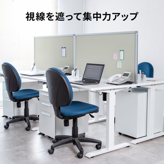 幅120cmタイプ(SPT-DPTC12040BL/GY)もしくは、幅140cmタイプ(SPT-DPTC14040BL/GY)をデスク正面に、 幅60cmタイプ(SPT-DPTC6740BL/GY)をデスク側面に取り付ければ、机を囲んでプライベートスペースを作り出せます。