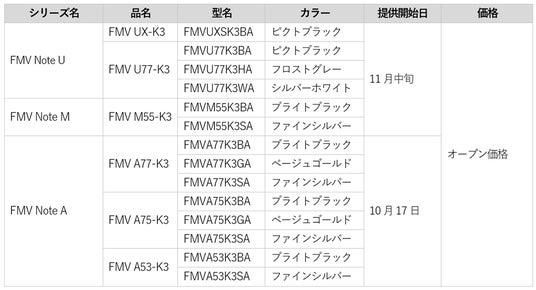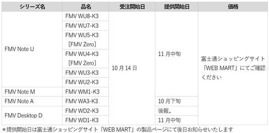 富士通ショッピングサイト「WEB MART」からは、セルフ交換バッテリーに対応したモデルや、高速通信の5G対応通信モジュール内蔵モデルが選択可能な「WU7-K3」に加え、動画配信サービスをお楽しみいただくための「Videoポータルアプリ」と専用の付属リモコン付きのモデルが選択可能な「WA3-K3」など、4シリーズ10機種を本日10月14日より順次受注開始します。
