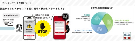「みやブル」は、「詐欺ウォール」の「ブラックリスト検知」「ヒューリスティック検知」「AI検知」の独自の検知エンジンを継承しつつ、 “家族をみまもる存在”として親しみやすさに改良を加え、さらにお客様に寄り添ったネット詐欺対策ソフトに生まれ変わりました。
