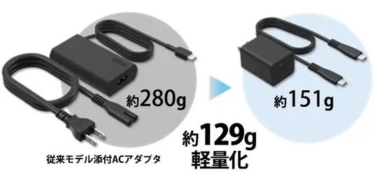さらに本体の軽量化だけでなく、付属品のACアダプタも小型化することによってさらなる持ち運びやすさを提供します。