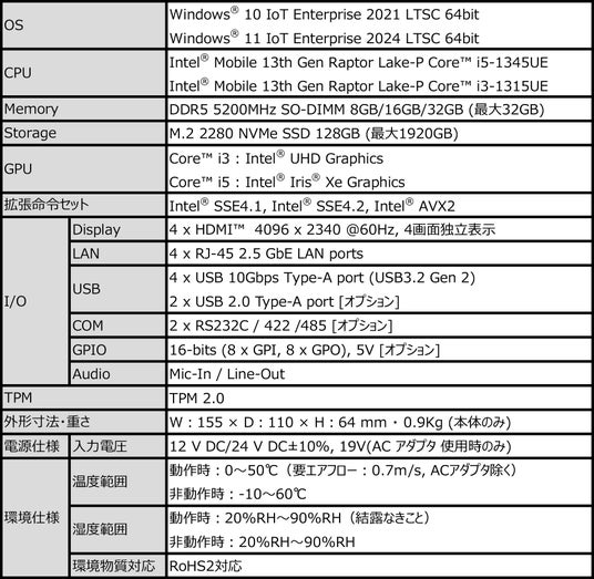 CPUは第13世代 Intel(R) Core(TM) プロセッサ(i5 / i3)を搭載。メモリとストレージはDDR5とNVMe SSDを採用し、メモリは最大32GB、SSDは最大1920GBに対応。インターフェースは2.5GbE LAN×4、USB 10Gbps(USB 3.2 Gen 2)×4、オーディオはLine-Out/Mic-Inを装備しています。