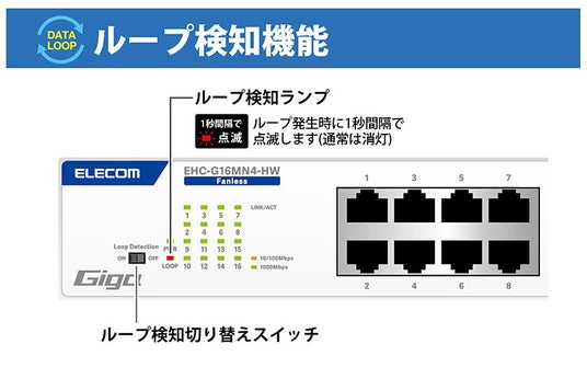 - ループ検知機能を搭載しています。LEDランプの点滅によりネットワークループ発生をお知らせし、ネットワーク障害の解消を促します。