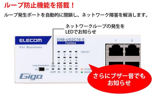 - ループ防止機能搭載により、ループ発生ポートの自動閉鎖を実現し、さらにLEDとブザーでお知らせします。通信障害が発生することを未然に防ぎ、業務の安定した遂行をサポートします。