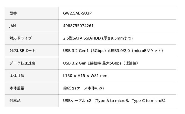 GW2.5AB-SU3P | 玄人志向 USB3.2 Gen1 接続 2.5型 SATA SSD/HDDケース