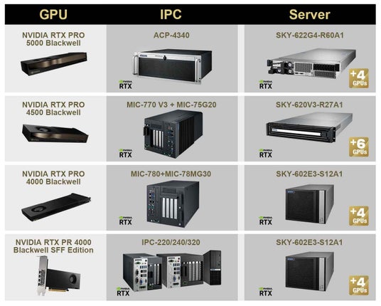 高性能な「NVIDIA(R) RTX PRO(TM) 6000 Blackwell」シリーズは、ワークステーション向けおよびサーバ向けモデルを含め、すでに市場に導入されています。アドバンテックは今回、新たに最大300Wの消費電力をもつ「NVIDIA(R) RTX PRO(TM) 4500」および「NVIDIA(R) RTX PRO(TM) 4000 Blackwell GPU」の対応を発表しました。これらのGPUは、グラフィックス処理、レンダリング、コンピューティングにおいて優れた性能を発揮し、NVIDIA Omniverse(TM) ライブラリを活用したアプリケーションや、大規模なAIワークロードに最適です。アドバンテックでは、「MIC-780」などのモジュール型産業用PCや、「SKY-620V3」などのサーバ製品との組み合わせを推奨しており、これにより高性能かつ柔軟性の高いエッジAIプラットフォームの構築が可能となります。