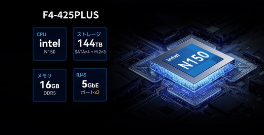 F4-425 PlusおよびF2-425 Plusは、最新のIntel N150クアッドコアプロセッサー(最大3.6GHz)を搭載し、16GB/8GB DDR5メモリとデュアル5GbEネットワークポートにより、最大1010MB/sの超高速転送を実現。高負荷のデータ処理やマルチユーザーアクセスにも余裕で対応します。