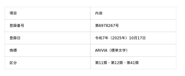 本登録により、ARIVIAブランドの知的財産保護体制を強化し、国内外での製品展開を本格的に進めてまいります。