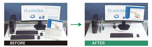 パソコン切替器(KVM)は、「1組のキーボード・ディスプレイ・マウス」で「複数のパソコン」を操作するための機器です。それぞれのパソコンに周辺機器を用意する必要がなく、広々とした作業環境を実現できます。