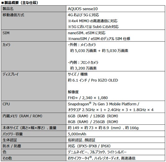 そのほか、5,000mAhの大容量バッテリー搭載、防水(IPX5・IPX8)・防塵(IP6X)(注10)、指紋・顔による生体認証、おサイフケータイ(R)、ハイレゾオーディオ、nanoSIMとeSIMのデュアルSIMにも対応するなど、日常生活の様々なシーンにて快適にご利用いただけます。