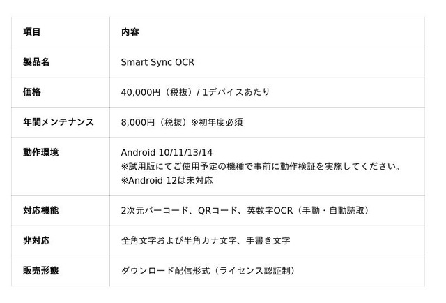本製品は、Android端末で撮影したバーコード・QRコード・文字情報を即時に認識し、Bluetooth接続されたPCや業務アプリケーションの入力欄へリアルタイムにテキスト転送するモバイルOCRアプリです。