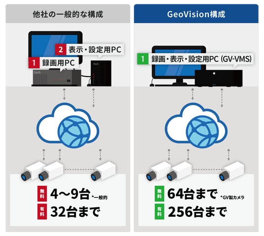 また、最大256カメラ接続に対応し、GeoVision IPデバイスは64カメラまで無料で接続可能です。