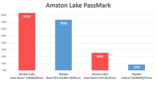 最新のAmston Lake世代のIntel Atom(R)プロセッサーは、下位クラスのモデルでありながら、従来のSkylake世代Celeron(R)を最大125%上回る性能を発揮し、一部のベンチマークにおいては、Xeon(R)プロセッサーに匹敵するパフォーマンスを実現しています。
