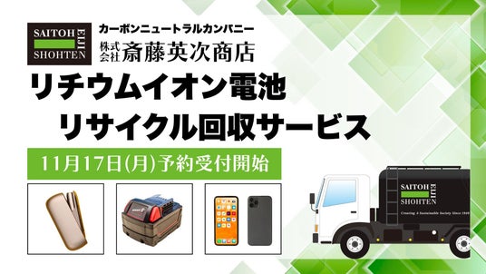 株式会社斎藤英次商店(本社:千葉県柏市、代表取締役社長:斎藤大介)は、11月17日(月)から法人を対象とした新サービス『リチウムイオン電池リサイクル回収』の受付を開始します。喫緊の社会課題となっているリチウムイオン電池の火災問題を解決し、再資源化によるサーキュラーエコノミーの推進に向けた新たな取り組みとなります。