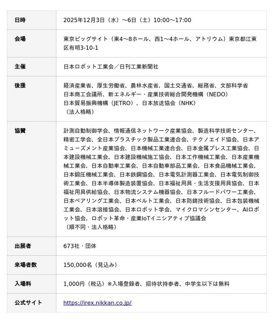 【「2025国際ロボット展」について】(https://irex.nikkan.co.jp/)