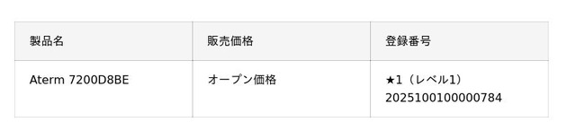 NECプラットフォームズでは2025年3月から運用開始された、IoT機器のセキュリティ品質の新基準JC-STARに適合したWi-Fiホームルータ(Aterm製品)の展開を進めており、現在「Aterm 7200D8BE」がJC-STAR★1(レベル1)(注2)適合ラベルを取得しています。今後発売するAterm製品についてもJC-STARに適合予定です。