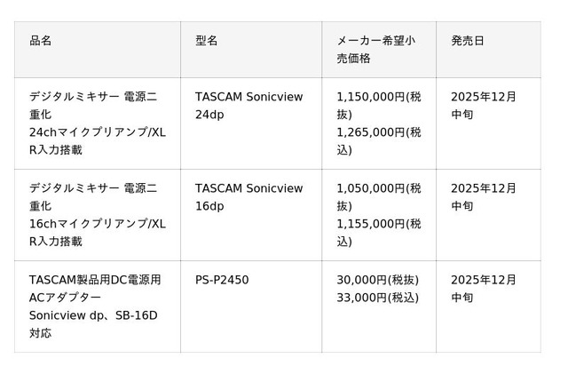 『TASCAM Sonicview 24dp』 https://tascam.jp/jp/product/sonicview_24/『TASCAM Sonicview 16dp』 https://tascam.jp/jp/product/sonicview_16/