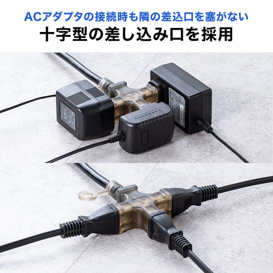 柔らかく取り回しやすい高耐久VCTケーブル採用した、十字型3口で複数機器をまとめて接続できる電源延長コード