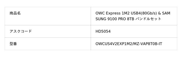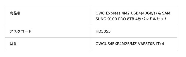 また、今回の取り扱い開始に合わせて、【OWC Express 1M2 USB4 (80Gbps)/4M2 USB4 (40Gbps) + Samsung 9100 PRO バンドルセット】の提供も開始いたします。