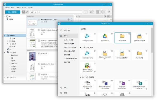 スキャン機能と、データの管理・活用を一つにまとめた、専用ソフトウェア「ScanSnap Home」(PC版)で、ストレスのないデータ管理を行うことができます。また、スキャン後に表示されるクイックメニューから保存先や送信先を選択でき、Microsoft Teams、SharePoint、OneNote、Notion、iCloudへの連携や、ScanSnap Cloudと連携しているクラウドサービスへの保存が可能です。(注2, 注3)