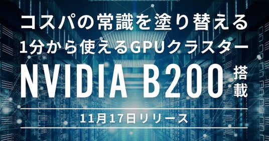 GPUクラウドサービス「GPUSOROBAN」を展開する株式会社ハイレゾ(本社:東京都新宿区、代表取締役:志倉喜幸、以下当社)は、10月7日に「NVIDIA B200搭載マルチノード型ハイエンドGPUクラスタ」として発表していたサービスにつきまして、NVIDIA B200クラスター構成の環境をGPU1枚・1分単位の課金で提供し、新たにポイント制を導入した「GPUSOROBAN 計算クラスター B200」として、本日付で正式リリースしましたことをお知らせいたします。