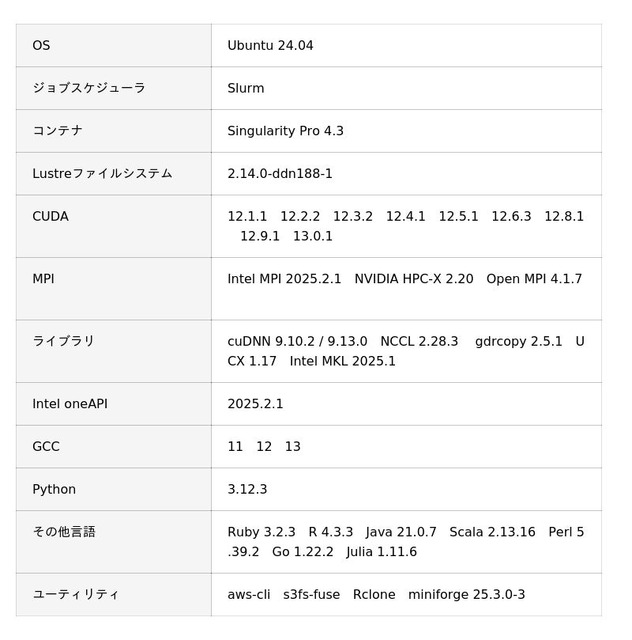 ジョブスケジューラのSlurm、Singularityコンテナ、Lustreファイルシステム、MPIなど、あらかじめ構築したクラスター環境をすぐに使える状態でご利用いただけます。