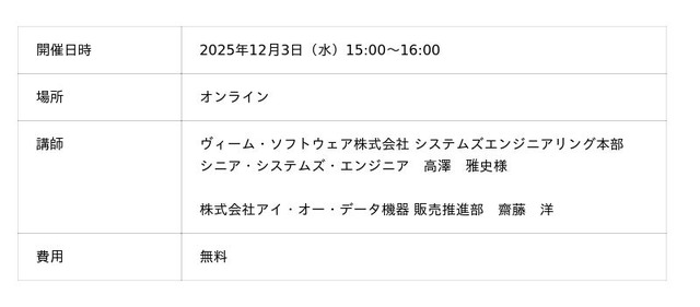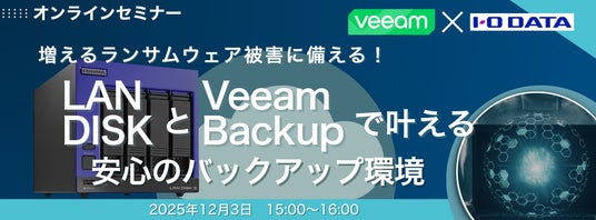 株式会社アイ・オー・データ機器(本社:石川県金沢市、代表取締役会長:細野 昭雄、以下、アイ・オー・データ)は、ヴィーム・ソフトウェア株式会社様との共同セミナー「増えるランサムウェア被害に備える!LAN DISK × Veeamで叶える“安心のバックアップ環境”」を開催します。