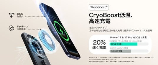 ESR独自のCryoBoost(R)冷却技術は、従来のように充電器本体を冷やすのではなく、オープンダクト構造の気流と航空宇宙グレードのアルミニウムから成る静音・超薄型ファンによって、デバイス自体を直接冷却します。その結果、一般的なQi2.2対応充電器と比べて最大約6°C低い動作温度を実現し、iPhone 17 Proをわずか30分で最大60%まで充電可能に。これにより充電速度は20%向上しながらも、バッテリーの健康と効率を維持します。さらに、薄型化されたファン設計により、持ち運びやすいスリムなデザインを実現しています。
