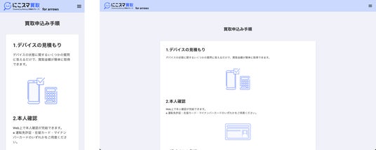 「にこスマ買取 for arrows」ページ(左:スマートフォン版、右:PC版)