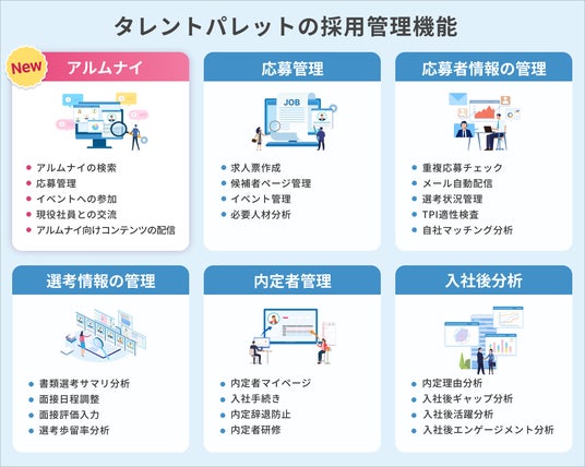 タレントパレットの採用管理システムは、新卒採用、中途採用、アルムナイ採用などの多様な採用活動から入社時の手続きまでを一元管理し、採用に関連する一連の業務の効率化・高度化を支援します。また、人事情報、経歴、スキル、マインド(適性)、社員の希望や想い、日々のモチベーションやエンゲージメントなどの人材データと連携することで人材の最適配置や育成を実現します。