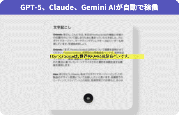 録音終了と同時にアプリへ自動転送。GPT-5/Claude/Geminiなど複数AIが要点を抽出し、「ペンを置いた瞬間、議事録が完成」する新しい体験を実現します。