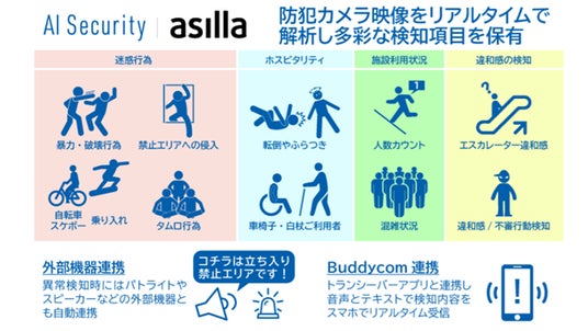 「AI Security asilla」は、既存の防犯カメラ映像をAIが解析し、異常行動(暴力、転倒、侵入など)や、注意行動(徘徊、混雑、体調不良など)をリアルタイムで検知するシステムです。24時間365日、AIが映像を監視することで、警備員の負担を軽減し、より迅速かつ正確な対応を可能にします。