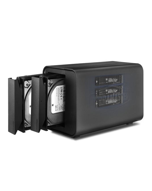 D5 HybridD5 Hybridは初のHDD×NVMe SSDハイブリッドエンクロージャで、2台のSATA HDD/SSDと3台のM.2 NVMe SSDを搭載可能、最大68TBの大容量ストレージと高速処理を両立します。独自の2+3 RAIDモードに対応し、工具不要で簡単にドライブ交換ができるうえ、USB 3.2 Gen2(10Gbps)による高速転送でプロの制作環境やデータ管理を強力にサポートします。