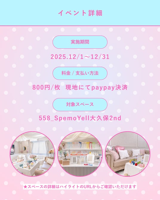 ●期間: 2025年12月1日(月)~12月31日(水)※期間中は24時間ご利用可能です●場所: 558_SpemoYell大久保2nd
