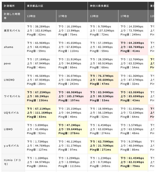 計測結果一覧では、下り速度について、上位3社がわかりやすく色付けされています(1位:赤色、2位:オレンジ色、3位:黄色)。