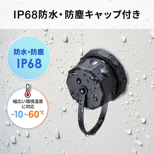 屋外での雨や、屋内でのホコリから守る防水防塵規格IP68に対応したキャップ付きです。使わない時はフタをして、水やホコリが入るのを防止できます。※付属キャップは着脱が可能です。