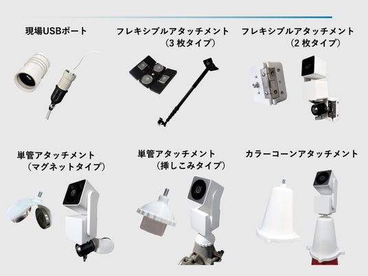 また、施工フェーズによって変化する建設現場を想定し、天井空の吊り下げや単管パイプ、カラーコーンなどの建設資材に簡単に取り付けできる「ソラカメ 建設現場向けアタッチメント」を用いたカメラの取り付け例をご紹介します。
