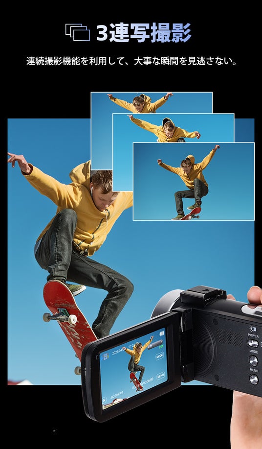 本製品は、こうした痛点を徹底的に改善。搭載した 4,500mAhの大容量バッテリー により、一般的なカメラが約1時間しか撮影できないところ、最大4.5時間の連続録画 を実現。長時間イベントも電池残量を気にせず撮影できます。