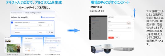 特に、11月にリリースした「Open Vocabulary Object Detection(OVD)」技術は、トレーニングデータが不要で、テキスト入力だけで対象物(例:クマや猿)の検知アルゴリズムを生成可能。精度向上のため現場写真を用いた最適化もサポートする。