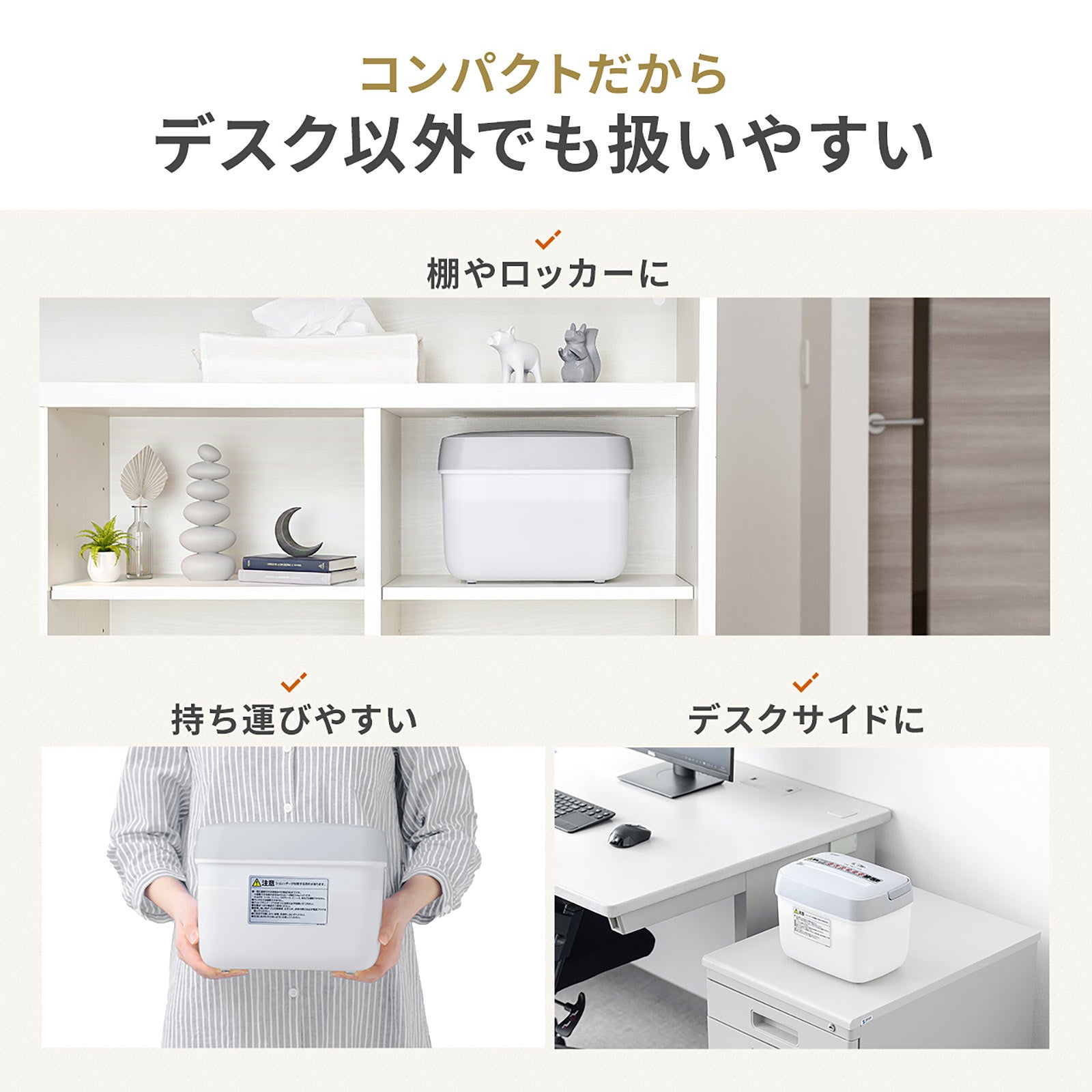 約5Lのダストボックスは、本体を持ち上げるだけで取り外せるシンプル構造。120枚程度の細断くずをためられ、こまめなゴミ捨ての手間が軽減されます。細断くずがこぼれにくい設計のため、作業後の片付けもスムーズ。忙しいデスクワークの中でもストレスなく扱えるユーザビリティを追求しています。