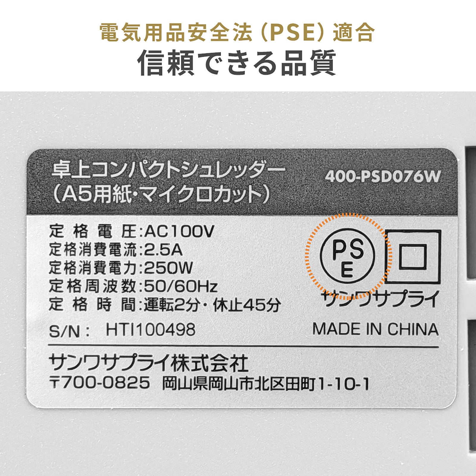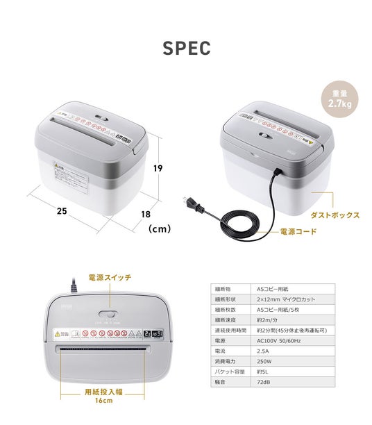 卓上シュレッダー コンパクトシュレッダー 電動シュレッダー A5対応 マイクロカット 2×12mm 電動 5枚同時細断 連続2分 5L