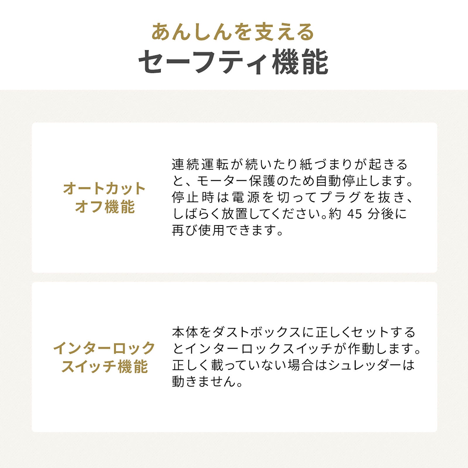 ダストボックスが正しくセットされていないと作動しないインターロックスイッチを搭載し、家庭や共用スペースでも安心して利用できます。さらに、2分以上の連続使用や紙詰まり時は自動停止するオートカットオフ機能も備え、モーター保護と安全性を両立。初めてシュレッダーを使う人でも扱いやすい設計です。