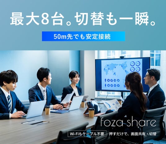 最大8台まで同時接続に対応し、パソコンはもちろん、スマートフォンやタブレットなど多様なデバイスで活用できます。会議やプレゼンテーション、授業や研修、家庭での映像共有まで--「設定に時間をかけたくない」「誰でも使える仕組みが欲しい」そんな現場のリアルな声から生まれた『foza share』は、共有のストレスをゼロにし、コミュニケーションの質そのものを変える新しいスタンダードです。