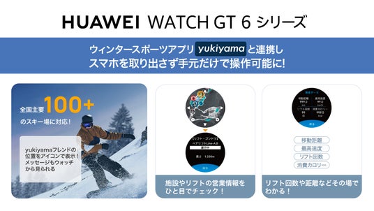 華為技術日本株式会社(ファーウェイ・ジャパン)は、スノーボーダー・スキーヤー向けスマートフォンアプリとして最大級のユーザー数を誇る「yukiyama」が、当社『HUAWEI WATCH GT 6 シリーズ』に、スマートウォッチとして初めて搭載されることをお知らせします。本アプリは本日、2025年12月19日(金)夜より提供開始します。