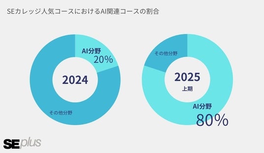 一方で、SEカレッジでは年々AI関連コースの需要が高まっています。2024年度の人気コースランキング(年間)で上位5コースのうち、20%がAI関連コースだったのに対し、2025年度上期(4月~9月)にはAI関連コースが80%をも占める結果となりました。