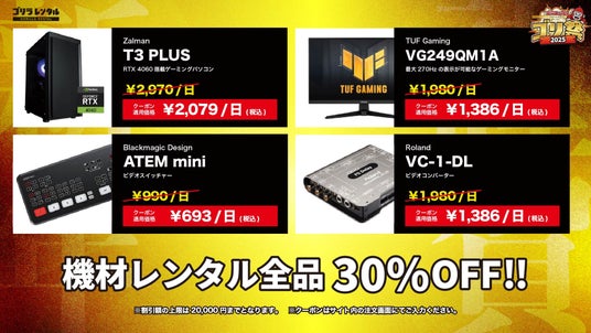 期間中、配信・撮影・イベント運営に必要な人気機材を全て30%OFF(割引上限:20,000円)でご提供。