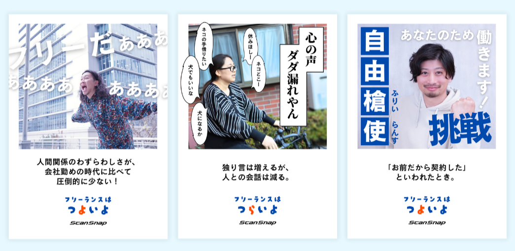 そこで、フリーランスの皆様が抱えるリアルな悩みや不安、そして「それでもやっぱりこの働き方が好き!」という瞬間を大募集。募集した内容からピックアップしたものを、展示会にて展示します。