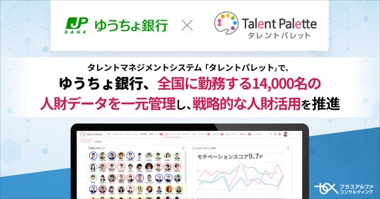 株式会社プラスアルファ・コンサルティング(本社:東京都港区、代表取締役社長:三室克哉、証券コード:4071)は、同社が提供するデータに基づく人材の活用、人的資本経営の実践、人事業務のDX化、リスキリングの推進などを目的に、多くの企業で導入が進むシェアNO.1(*)のタレントマネジメントシステム 「Talent Palette(以下:タレントパレット)」 の株式会社ゆうちょ銀行(本社:東京都千代田区、取締役兼代表執行役社長:笠間 貴之、以下:ゆうちょ銀行)への導入事例を公開しました。