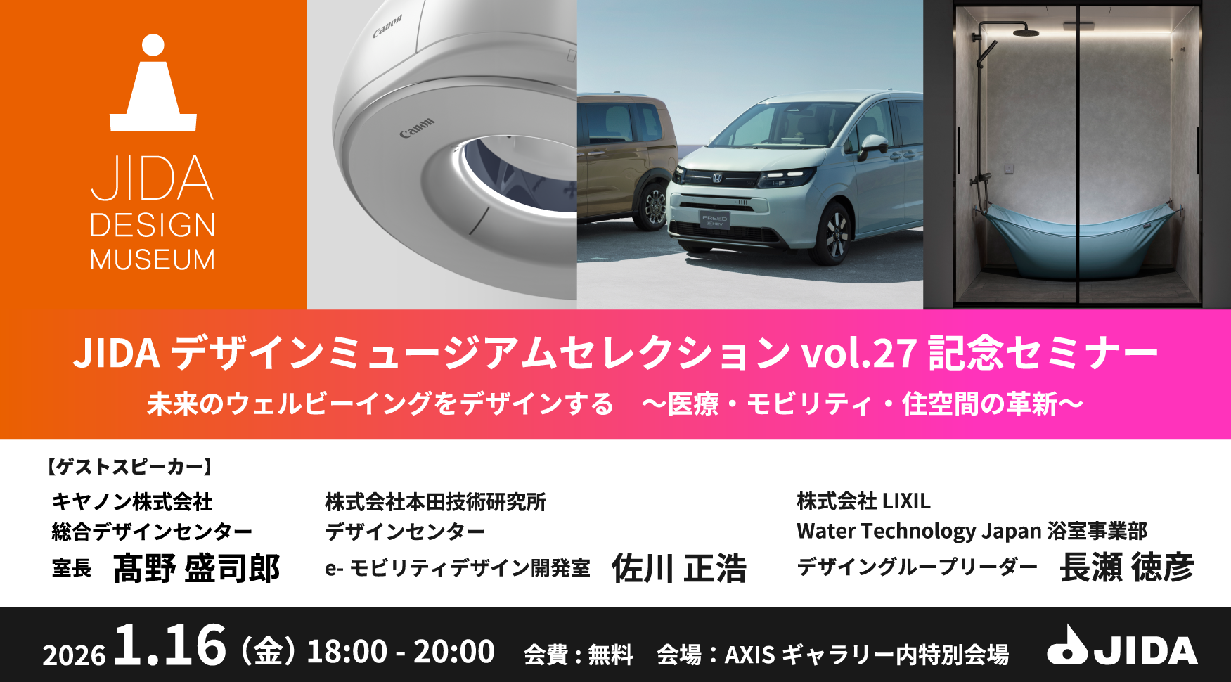 JIDA(公益社団法人日本インダストリアルデザイン協会)は、企画展『JIDAデザインミュージアムセレクション vol.27』を1月開催。1月16日(金)開催のプレス内覧会、記念セミナーも参加者受付中。